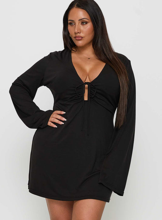 30% İndirimDafnie Uzun Kollu Mini Elbise Siyah Kavisli